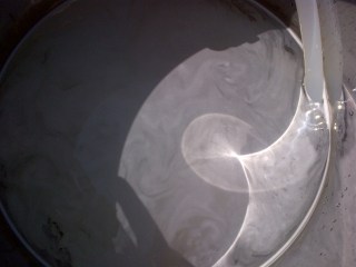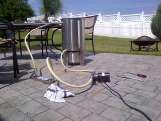 Today, I set up the BK, pump, chiller circuit and ran some One Step cleanser through it. This was meant not only to clean but more importantly to test run the setup before brew day tomorrow. Worked great! I couldn’t be more thrilled. The test run did expose some leaks, but after tightening up a few spots I think I’m ready. Got some nice whirlpool action inside the kettle, too, and I dropped an extra tablespoon of One Step powder into the kettle which didn’t take long to find its way into a tidy little pile in the center.