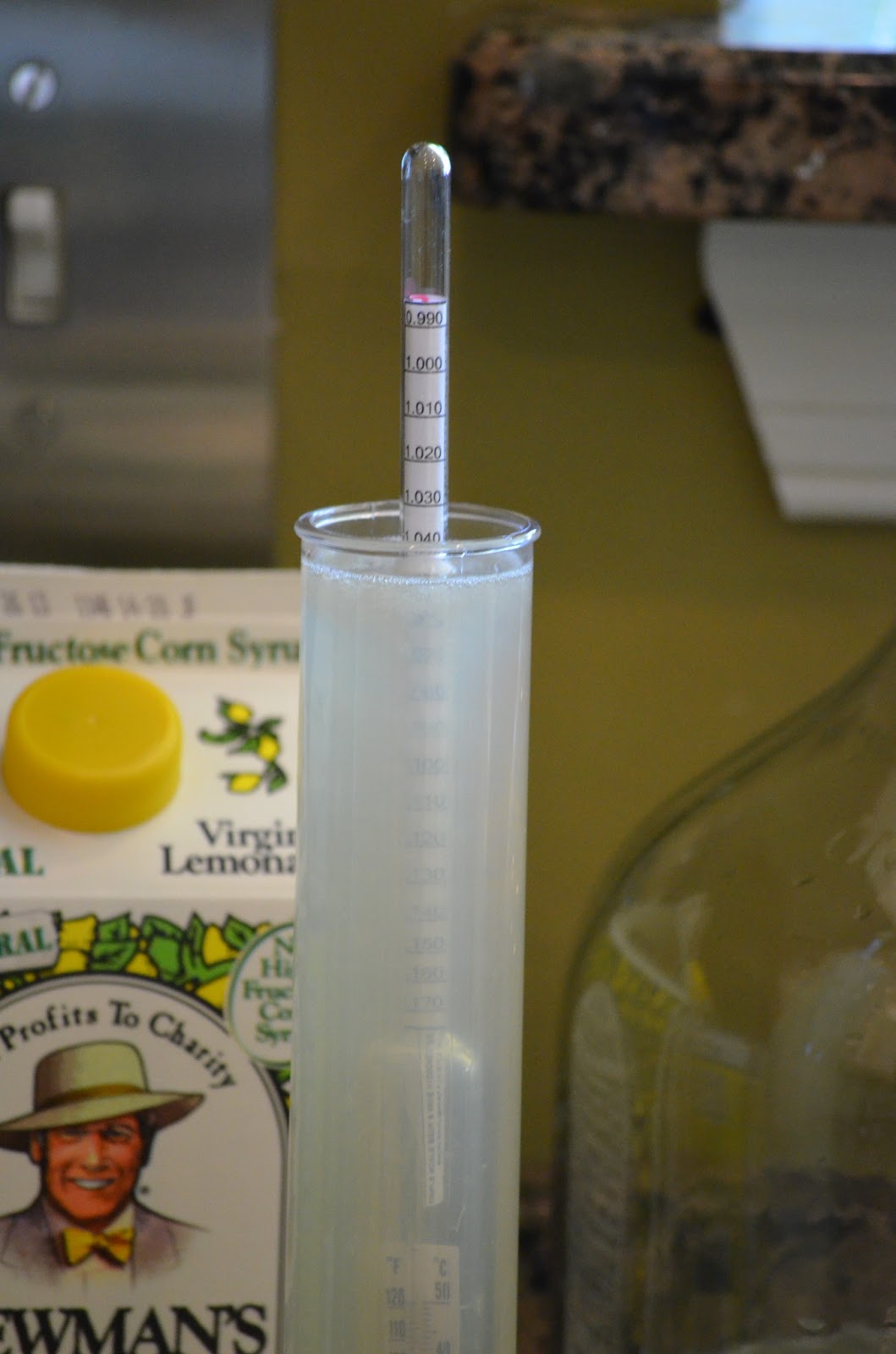 Gravity reading of the lemonade shows about 1.044, so just about right for a starter. |
