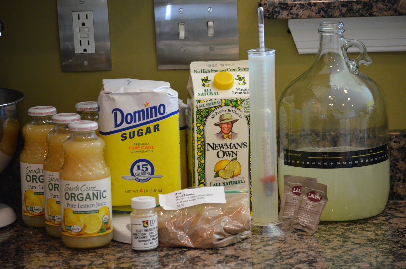 Mis en Place. This thing is basically just pure lemon juice, a little wine tannin, some water and lots and lots of sugar. Oh and of course some heavy duty wine yeast. |