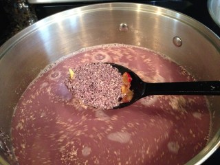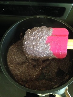 Once cooled to room temperature, the layer of purple liquid (upi) was carefully ladled off the top until a thin grayish gelatinous layer (misqui kketa) is revealed. That layer is scooped into a small saucepan and heated until darkened. Once darkened,the misqui kketa is stirred back into the upi and the entire concoction undergoes a 60 minute boil.